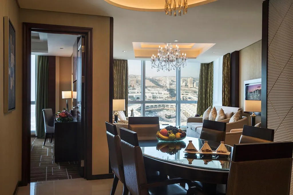 Partial Holy Haram view, seating area with sofa, small kitchen, dining table, LCD